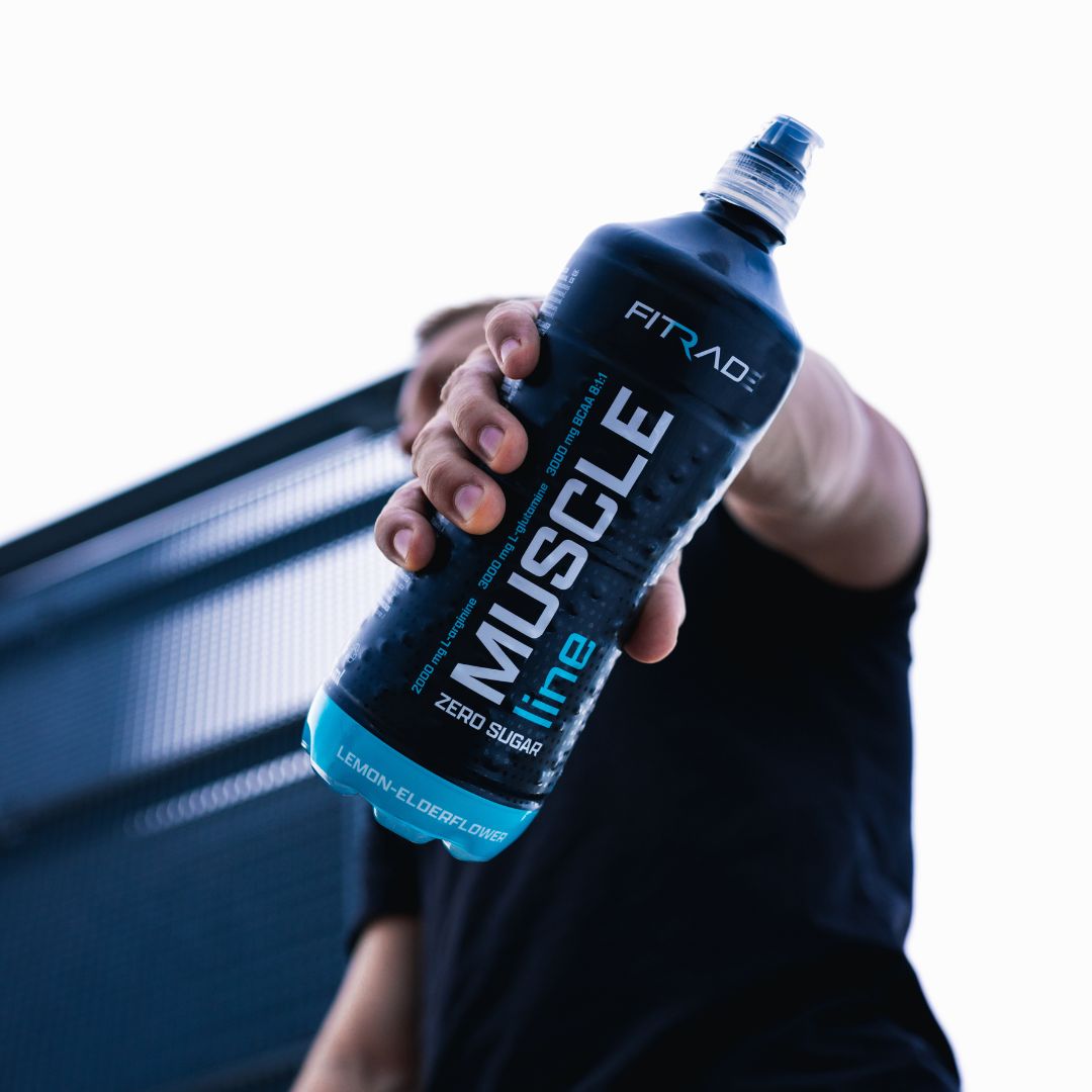 FITRADE MUSCLE line bebida funcional sin gas con sabor a limón y flor de saúco, con aminoácidos y edulcorantes. Sin azúcar.